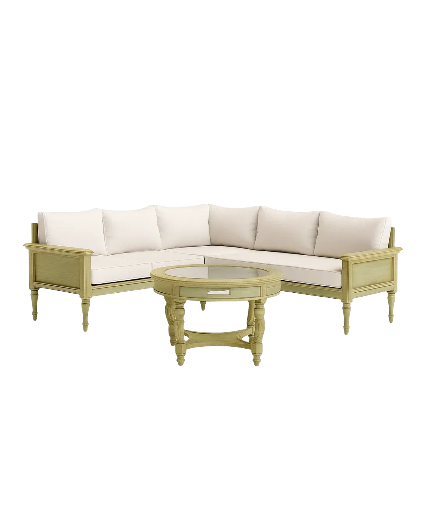 Ensemble de canapés d’angle de terrasse en bois avec table basse en verre et coussins en polyester